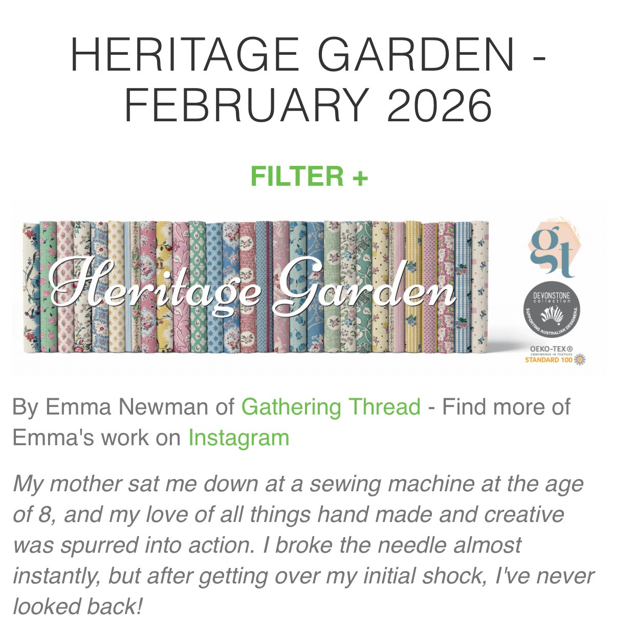 Fabric - Packs, Kits & Panels - PreOrder Heritage Garden by Emma Newman Fat 1/4 Pack. (Must be placed as a separate order) is backordered and will ship as soon as it is back in stock.