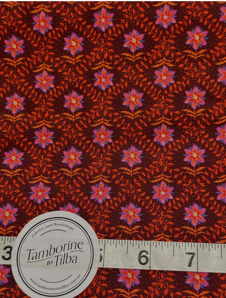 Fabric - Floral - (3474) Pink Flowers with Orange Leafy Crosshatching