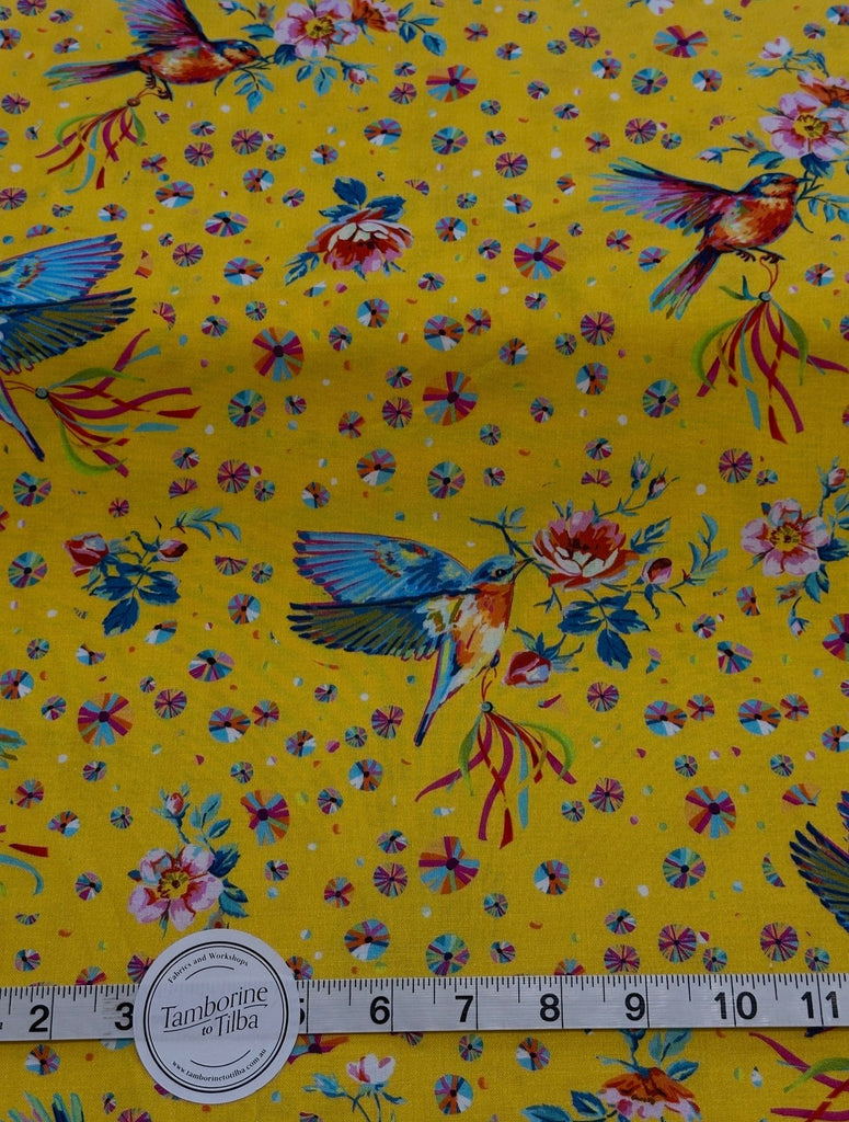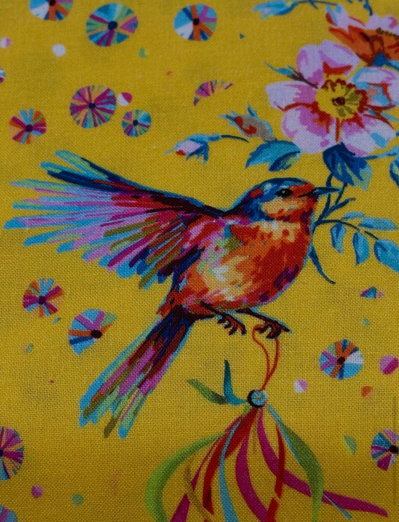Fabric - Birds, Animals & Insects - (3477) Birds & Flowers on Bright Yellow