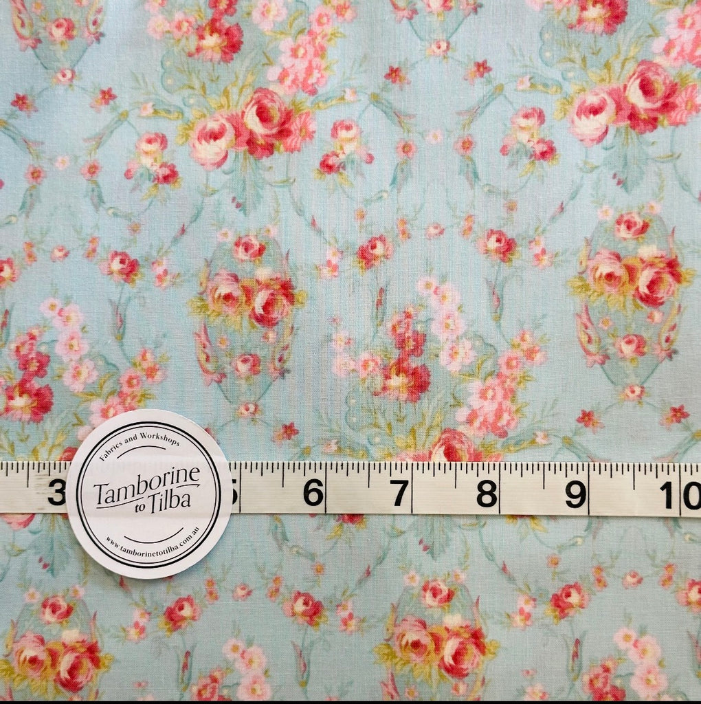 Fabric - Floral - (3473) Roses in Pinks with Blue & Green on Blue