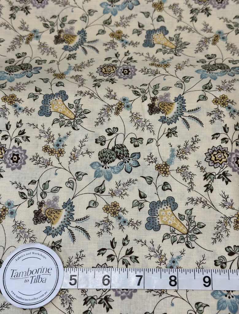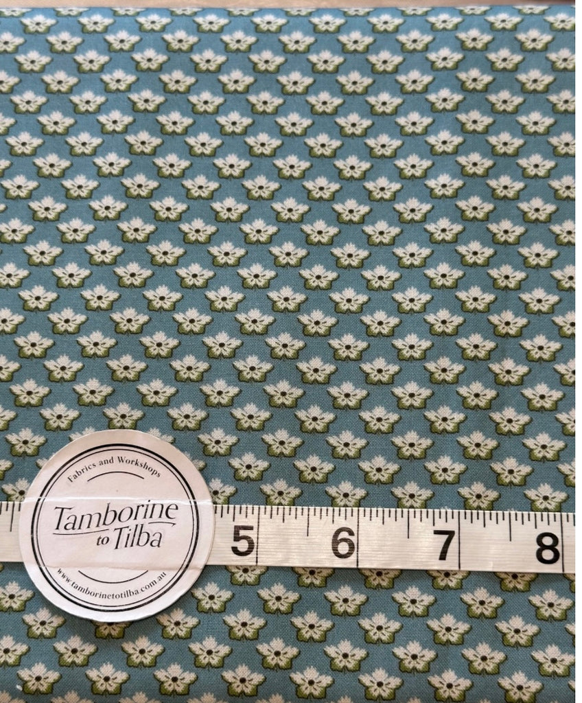 Fabric - Reproduction - (3088) Luccello Green & Vanilla Flower on Blue