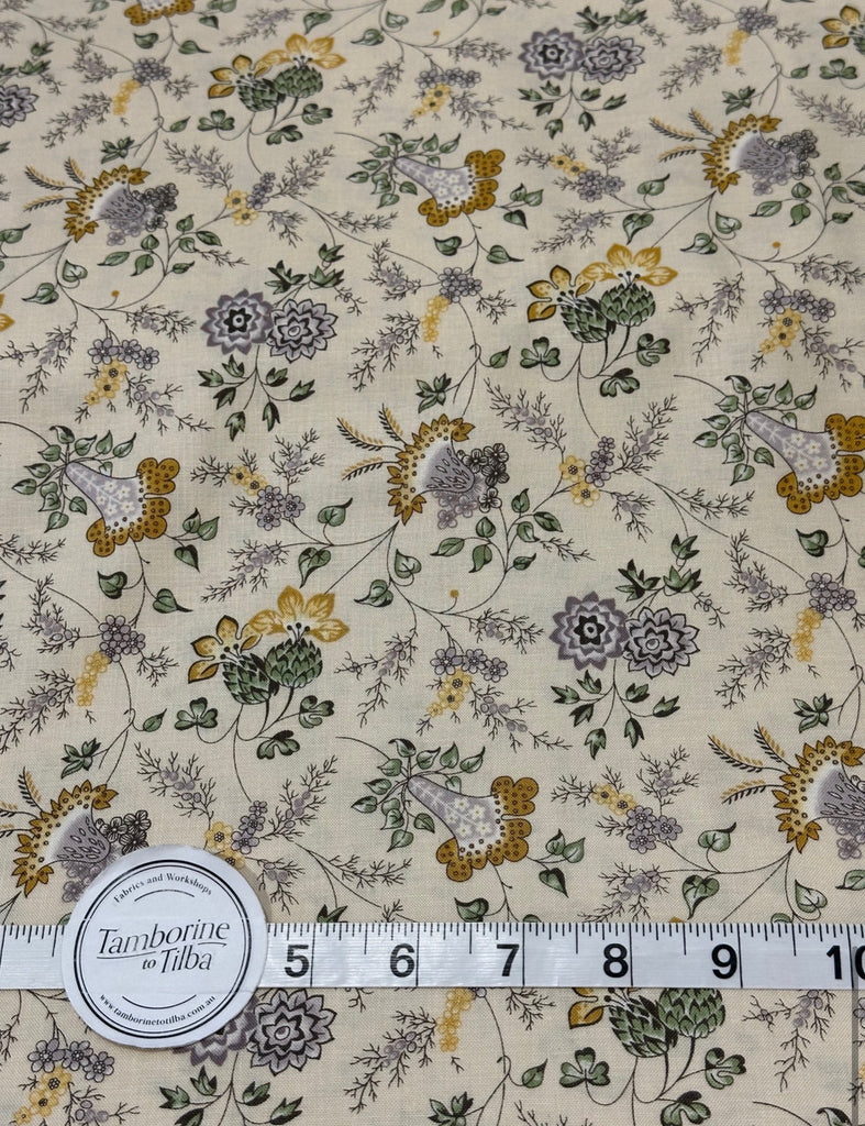 Fabric - Reproduction - (2960) Holbrook Gold, Green & Mauve Jacobean Floral