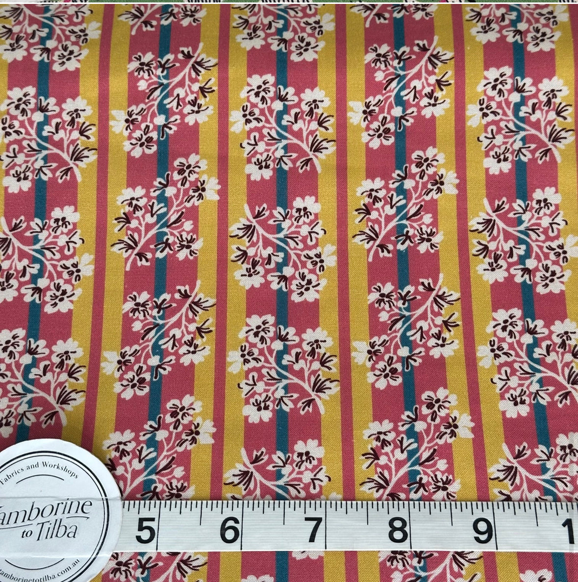 Fabric - Stripes - (3060) Guinevere Vanilla Floral on Pink, Blue & Yellow Stripes is backordered and will ship as soon as it is back in stock.