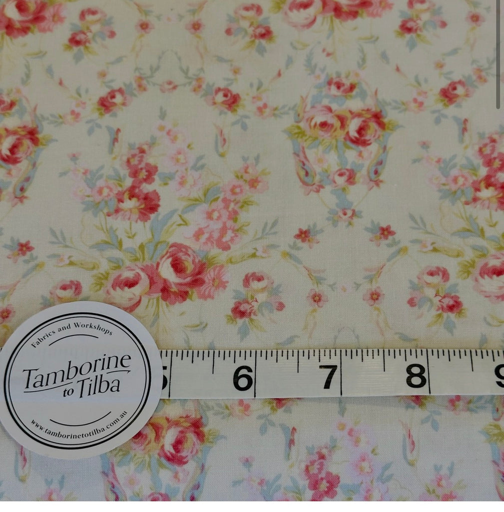 Fabric - Floral - (3468) Roses in Pinks with Blue & Green on Vanilla