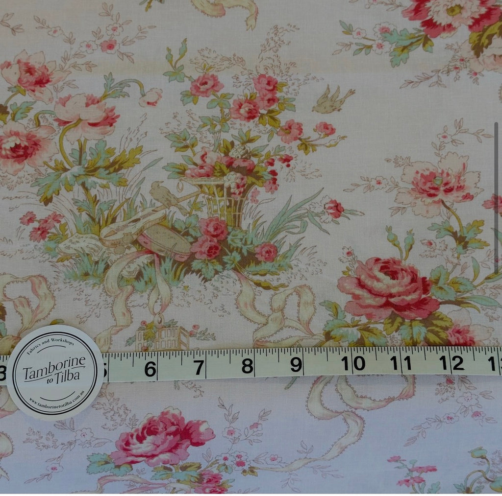 Fabric - Floral - (3467) Beautiful Blooms, Baskets & Ribbon on Pale Pink