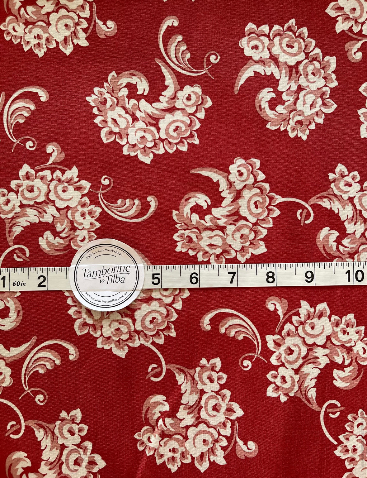 Fabric - Floral - (2846) Jane Austen Vanilla Swirled Floral on Red is backordered and will ship as soon as it is back in stock.