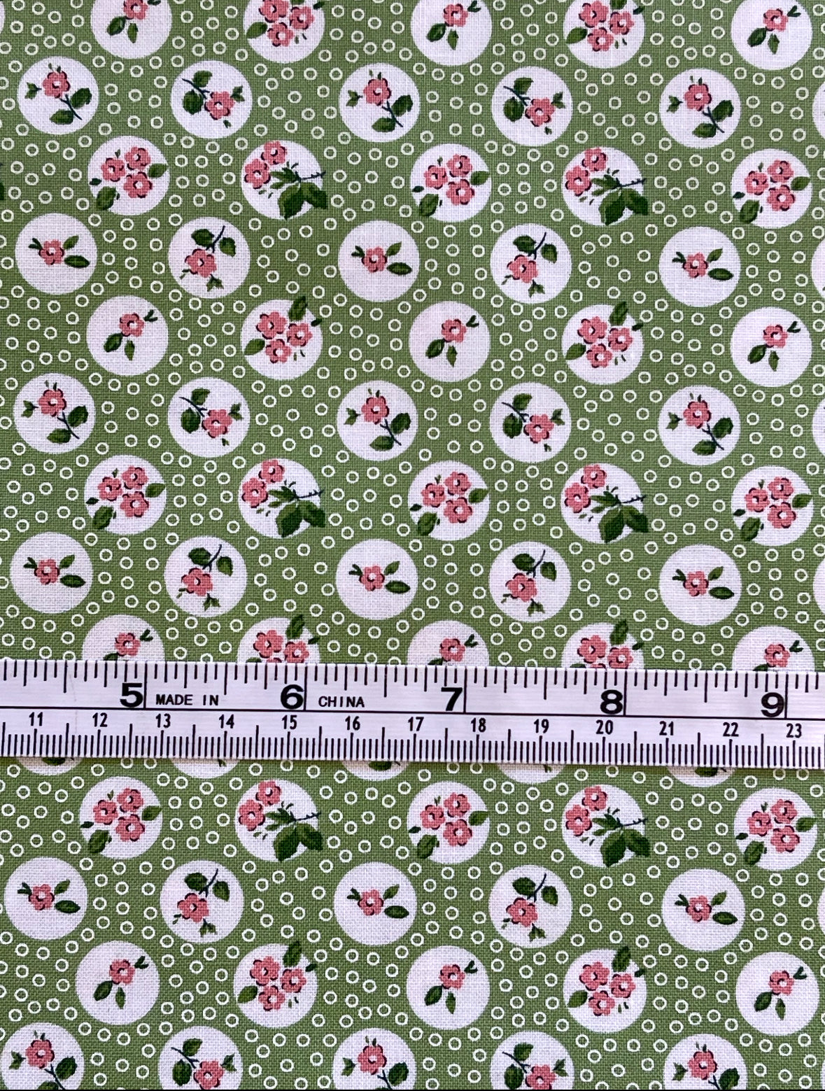 Fabric - Floral - (3319) Little Pink Flower in White Circle on Green Background is backordered and will ship as soon as it is back in stock.