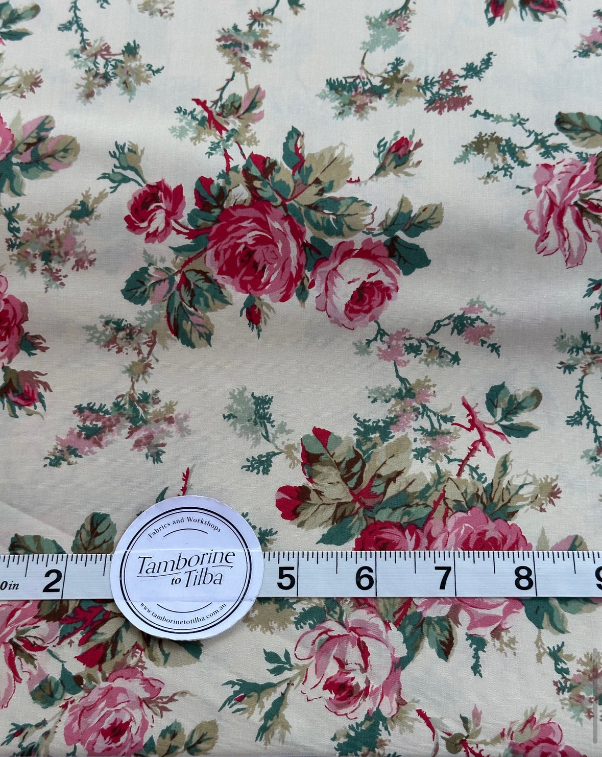 Fabric - Yuwa - (3135) Exquisite Pink & Green Roses on Vanilla is backordered and will ship as soon as it is back in stock.