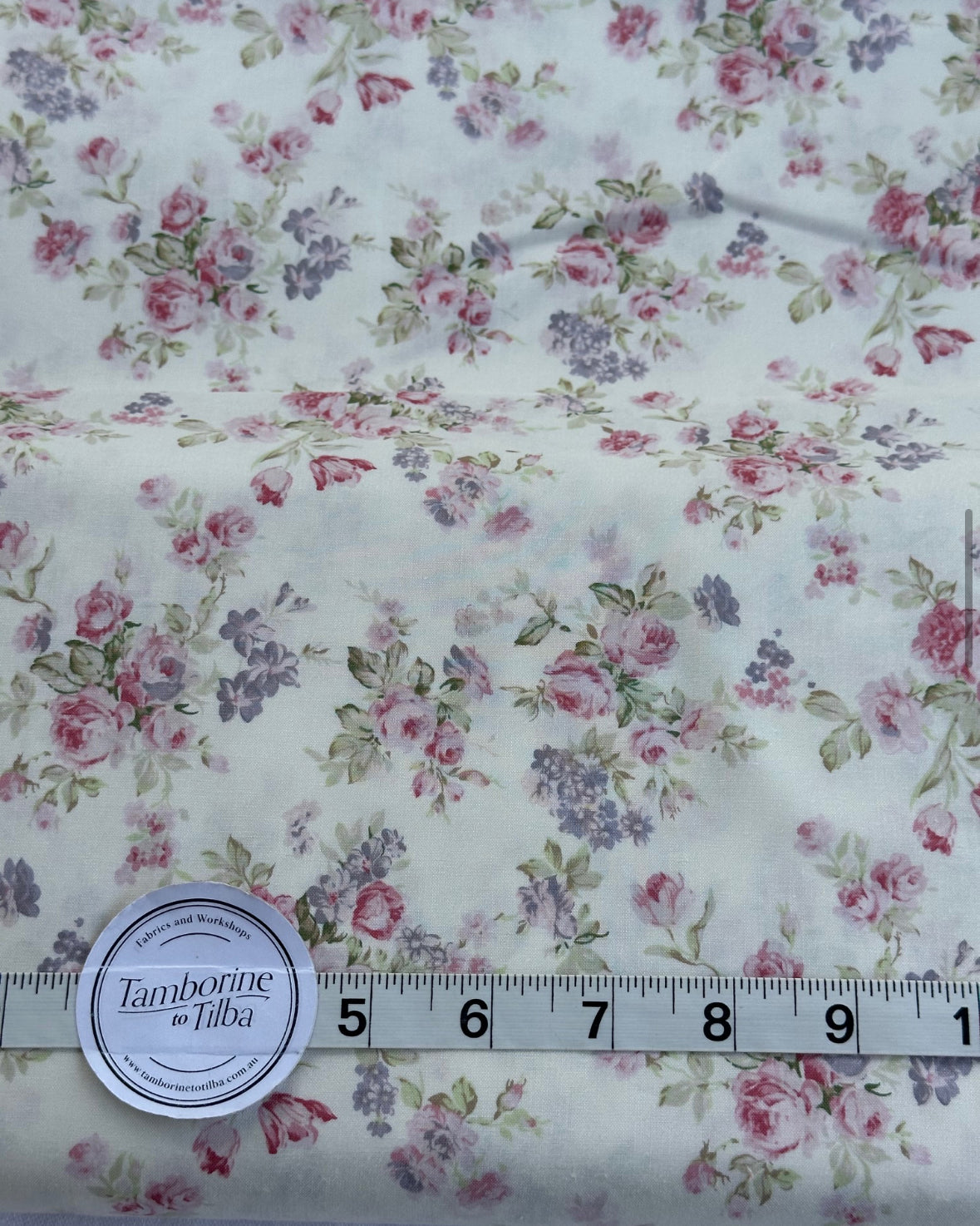 Fabric - Yuwa - (3139) Dusty Pink, Purple & Soft Green Floral on Vanilla Background is backordered and will ship as soon as it is back in stock.