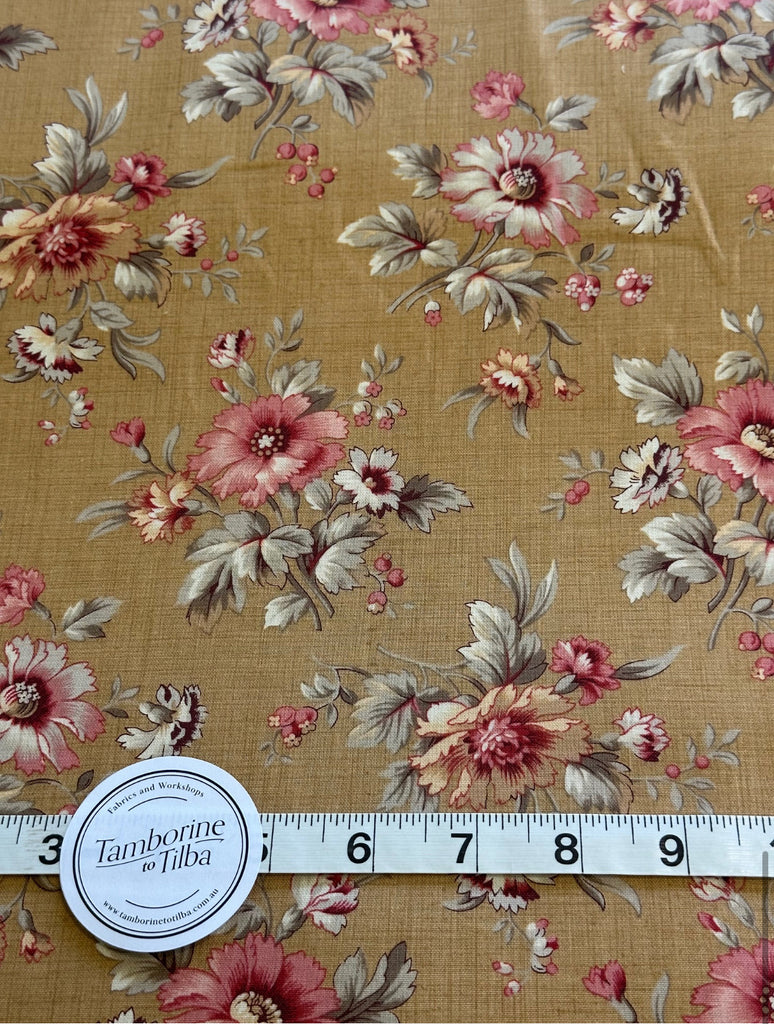 Fabric - Floral - (3326) French General Joie De Vivre Medium Blooms on Caramel/Gold