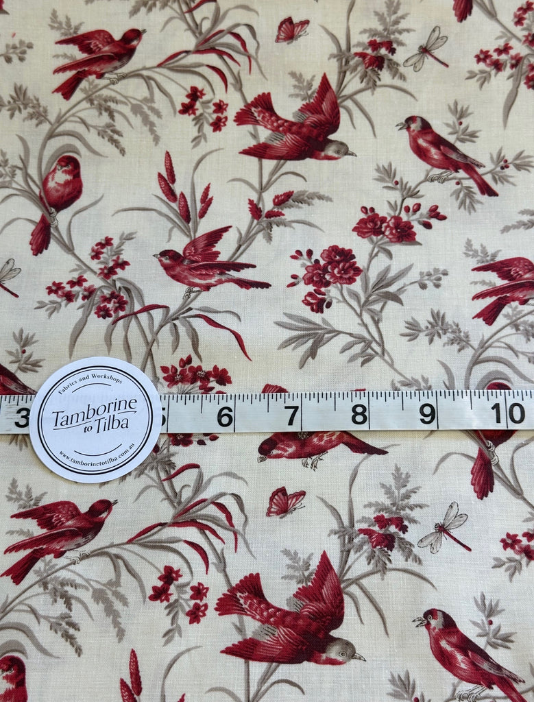 Fabric - Floral - (3320) French General Joie De Vivre Red Birds on Vanilla