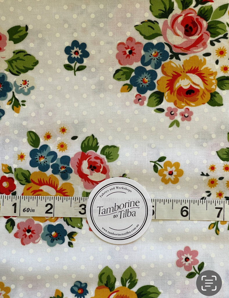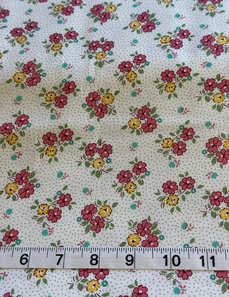 Fabric - Floral - (3288) Aunt Grace Sweet Bouquets in Pink, Yellow & Turquoise on Fine Light Blue Spotted Background