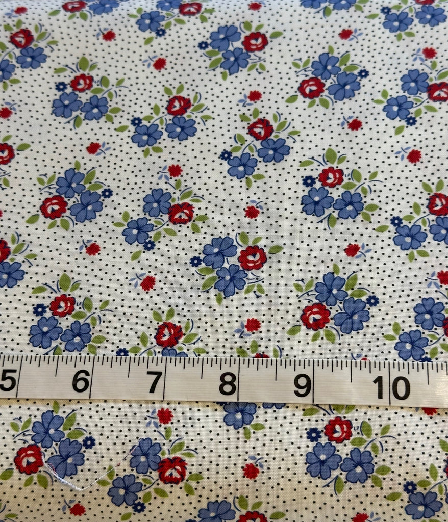 Fabric - Floral - (3289) Aunt Grace Sweet Bouquets in Red, Green & Blue on Fine Blue Spotted Background