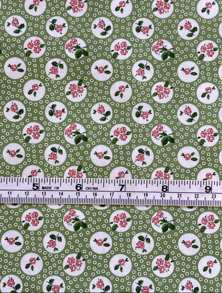 Fabric - Floral - (3319) Little Pink Flower in White Circle on Green Background