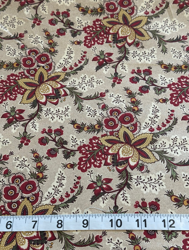 Fabric - Reproduction - (3276) Red, Gold & Green Floral on Taupe Picotage Background