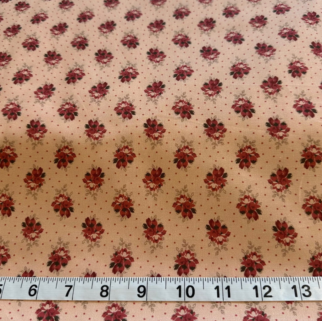Fabric - Reproduction - (3277) Rich Red Blooms on Peach Background with Tiny Pink Spots