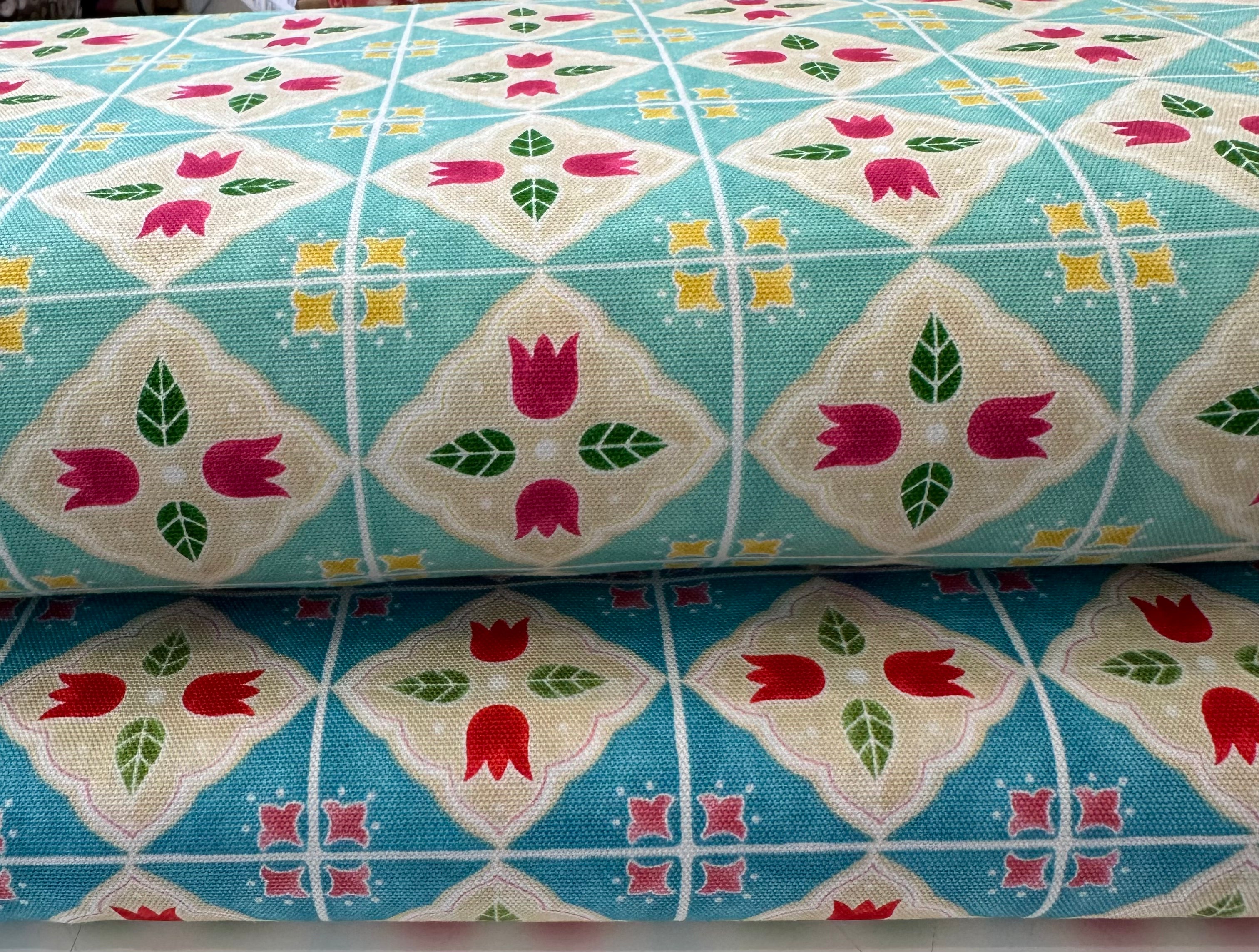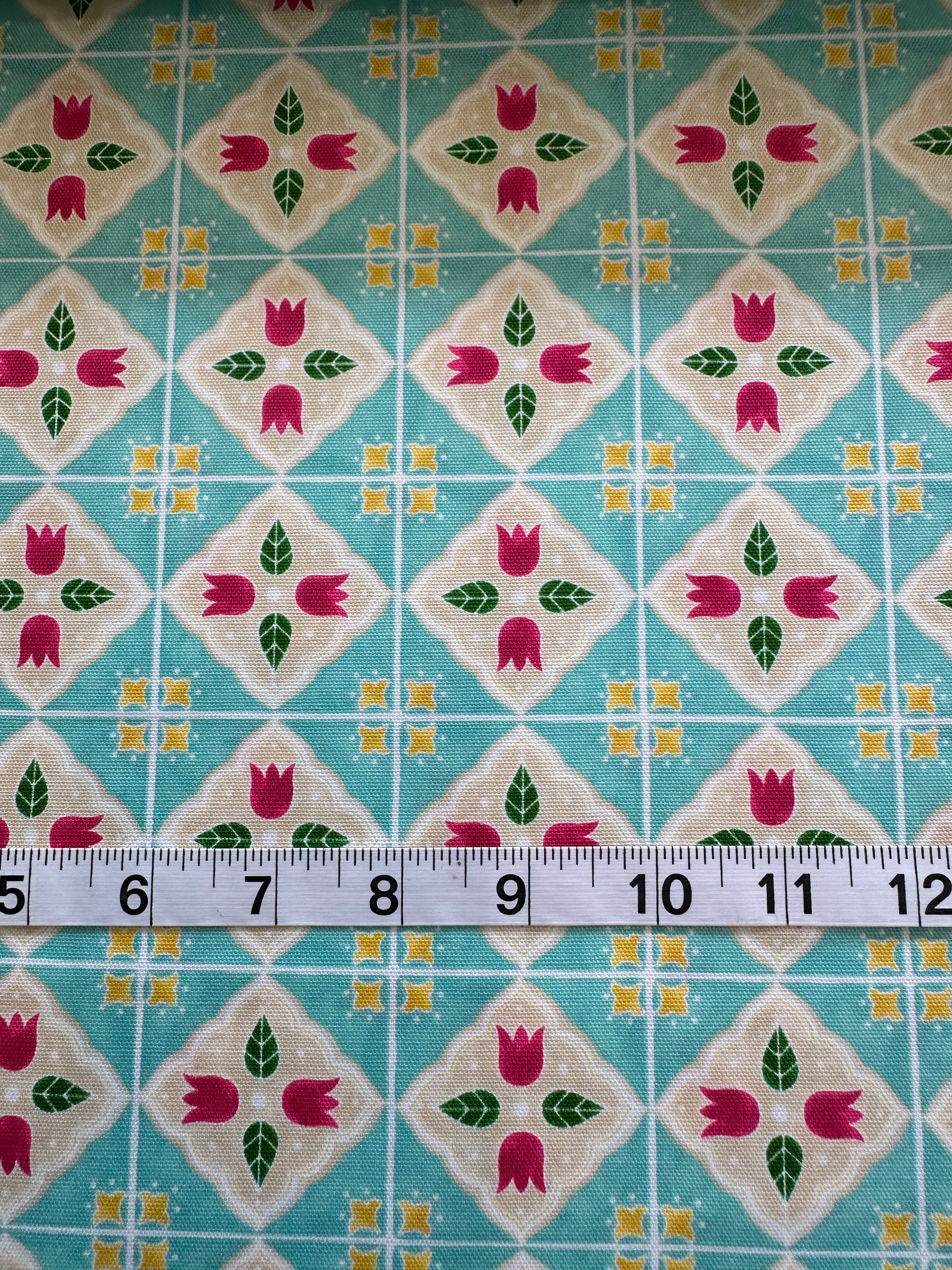 Fabric - Floral - (1356) Red Tulips in Squares on Aqua is backordered and will ship as soon as it is back in stock.