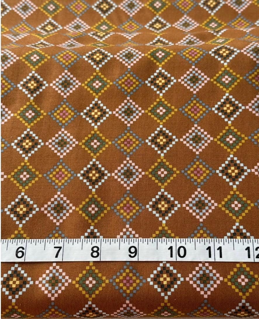 Fabric - Geometric - (3234) Pink, Grey, Green, Blue, Black & Mustard on Tan is backordered and will ship as soon as it is back in stock.
