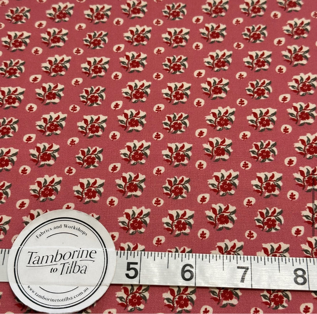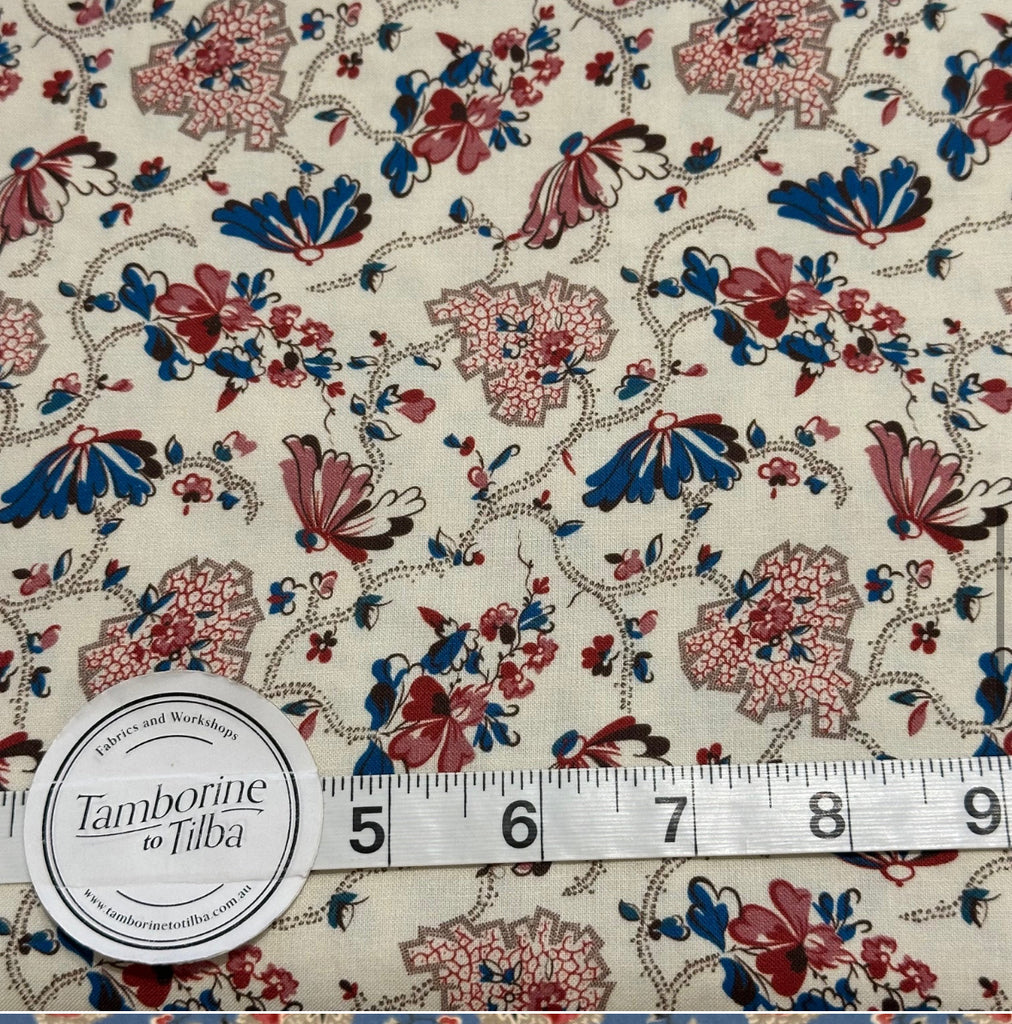 Fabric - Floral - (2137) Judy Newman’s Milkwood - Blue, Red & Green Sprigs with Pink Spots on Cream
