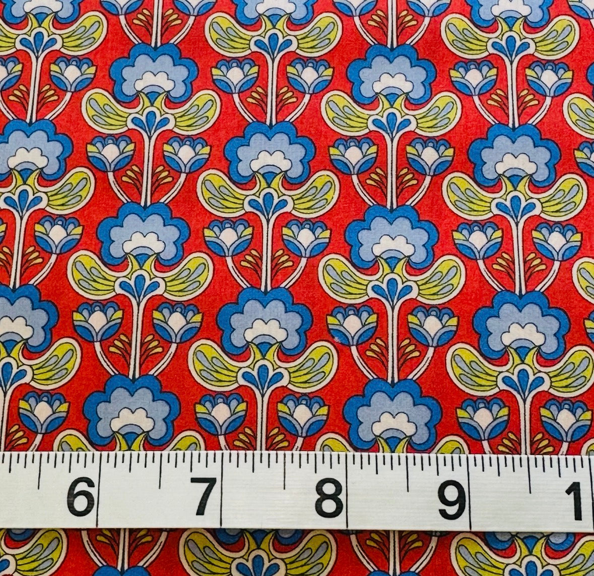 Fabric - Liberty - (3464) Blues & Green Stylised Floral on Red is backordered and will ship as soon as it is back in stock.