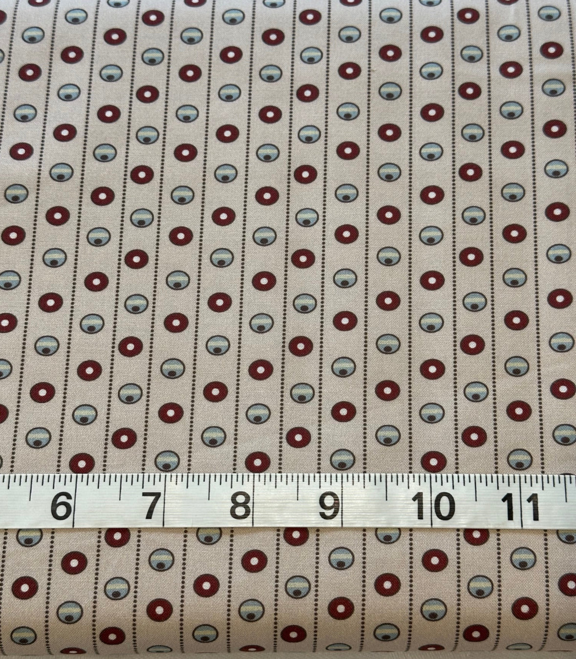 Fabric - Reproduction - (3299) Inglenook by Margaret Mew The Mill House with Turkey Red & Blue Fishegg Spot on Fawn is backordered and will ship as soon as it is back in stock.