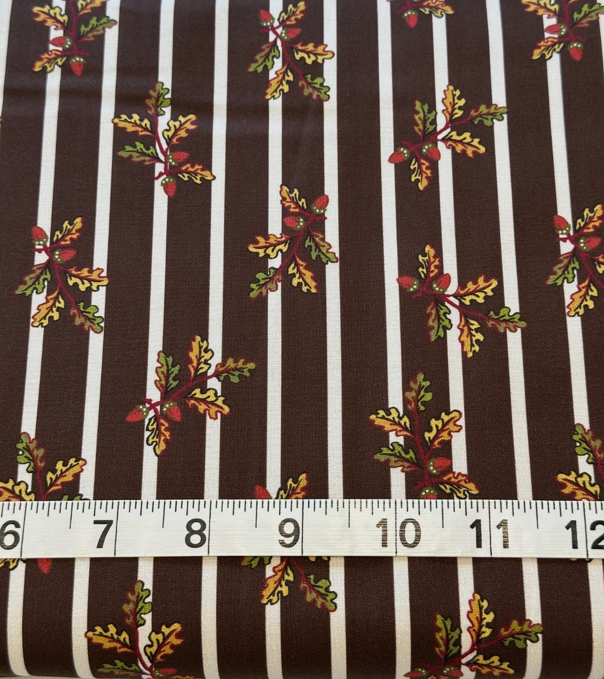 Fabric - Reproduction - (3308) Inglenook by Margaret Mew The Farm House Acorns in Autumn Colours on Chocolate Stripe is backordered and will ship as soon as it is back in stock.
