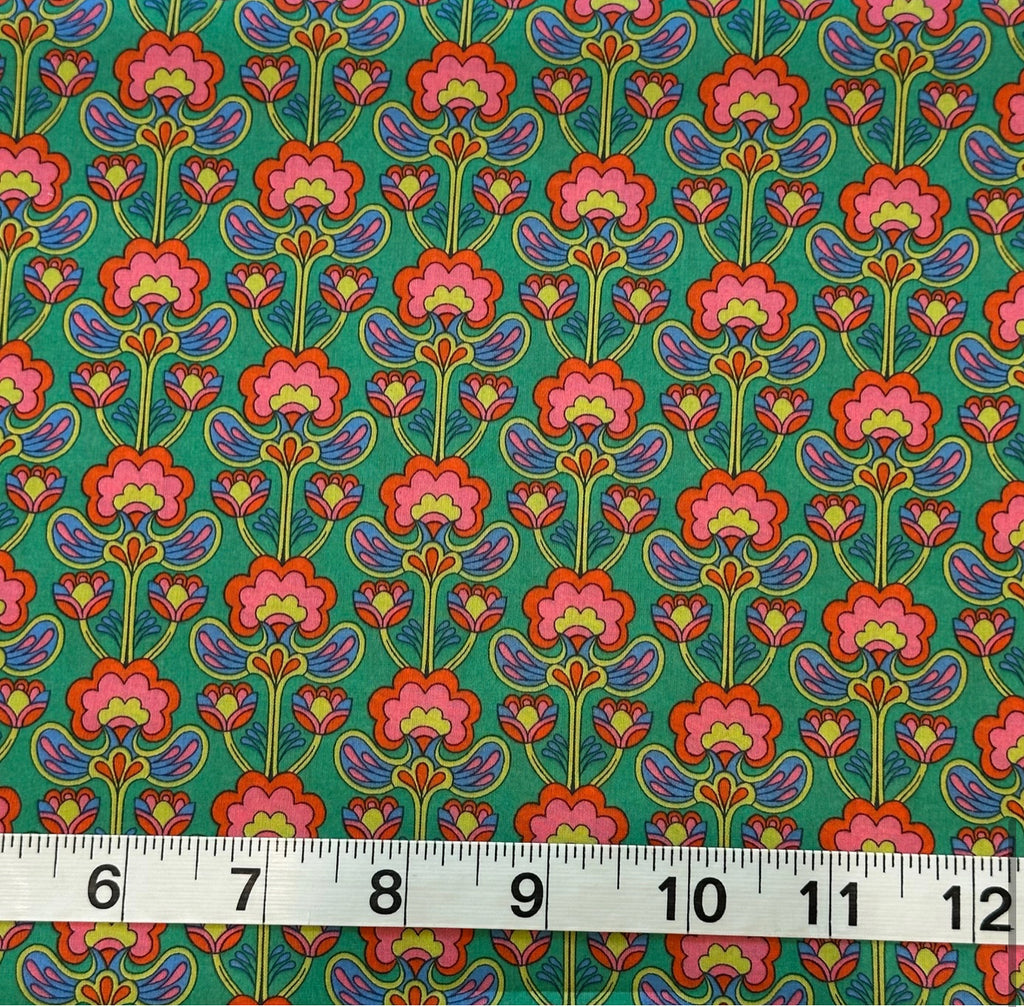 Fabric - Liberty - (3453) Orange, Pink & Yellow Stylised Floral on Green
