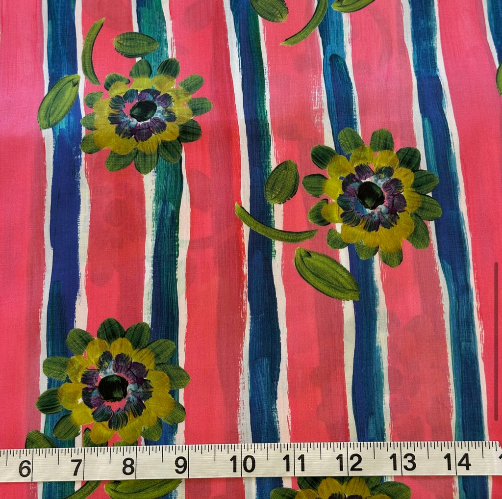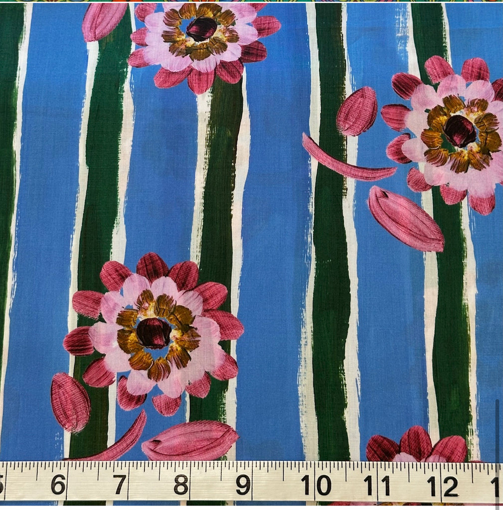 Fabric - Liberty - (3451) Pink Flowers on Cobalt, White & Green Stripes