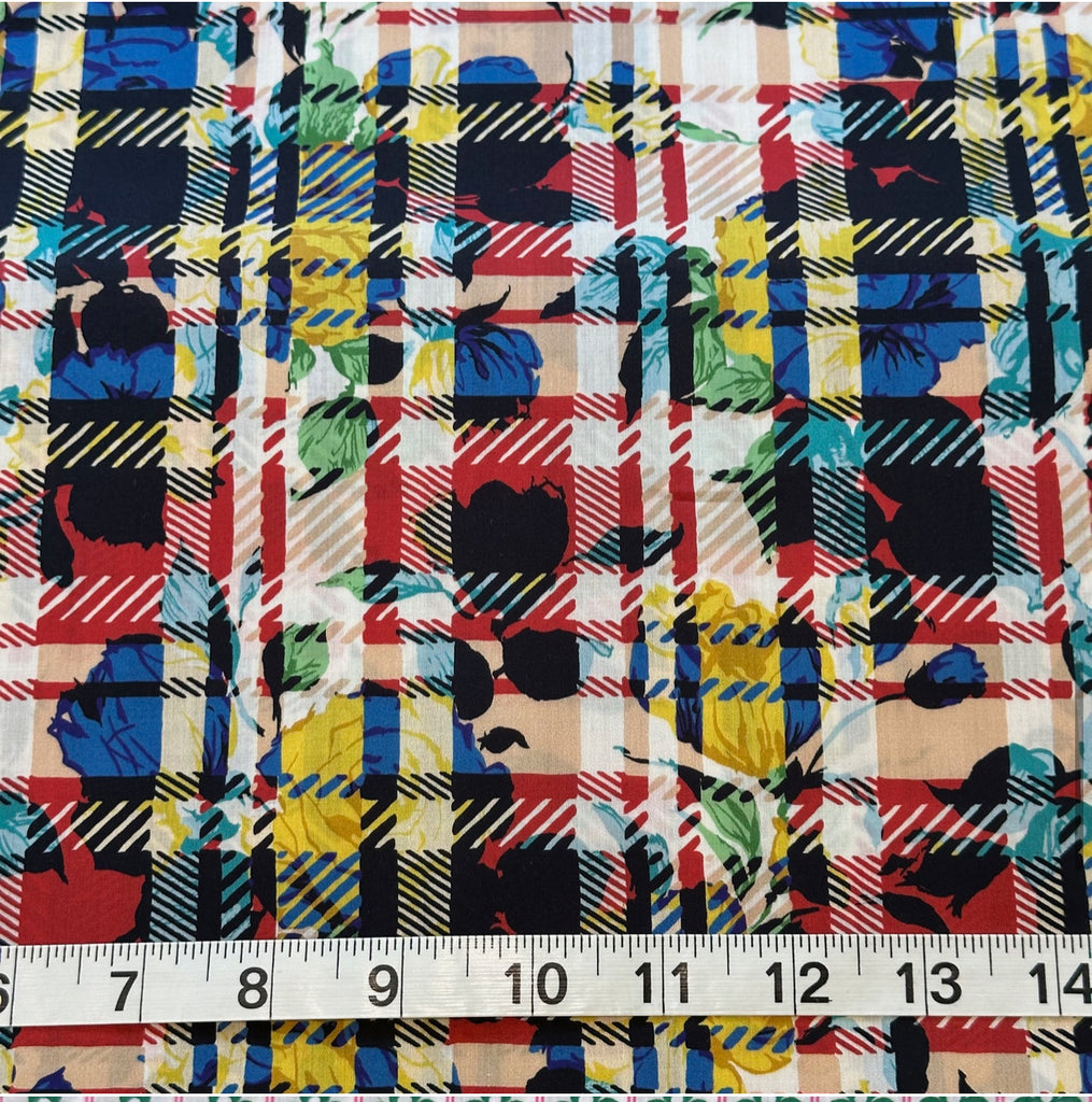 Fabric - Liberty - (3438) Vanilla Plaid on Brick Red & Ecru Floral Background