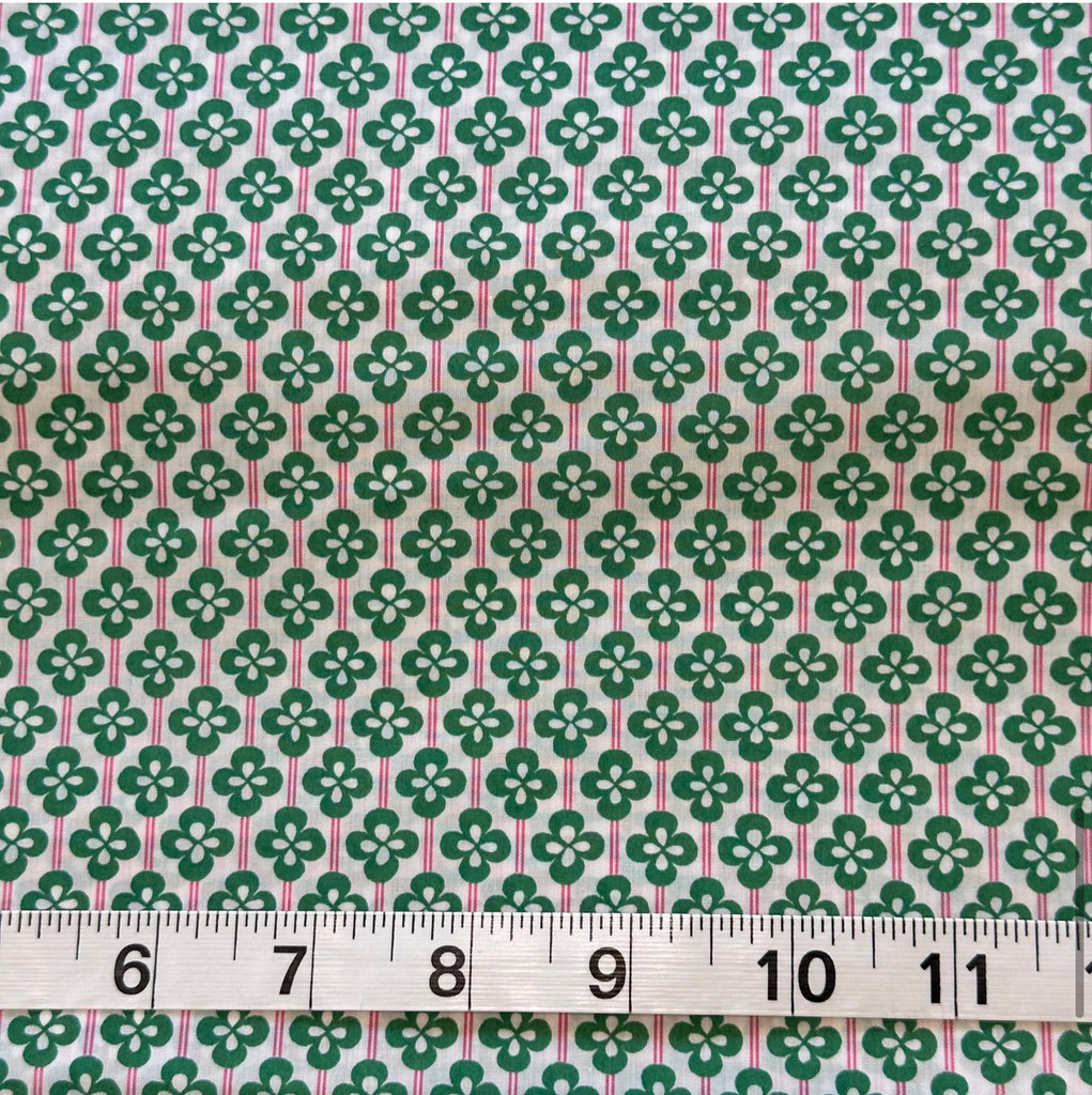 Fabric - Liberty - (3439) Green 4 Leaf Clover with Fine Pink Stripe on Vanilla Background