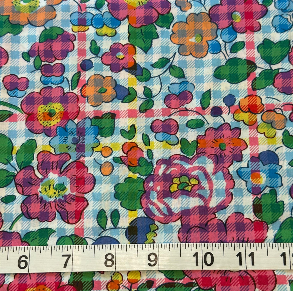 Fabric - Liberty - (3446) Blue, Bright Pink, Gold & Green Floral on Blue & Vanilla Plaid
