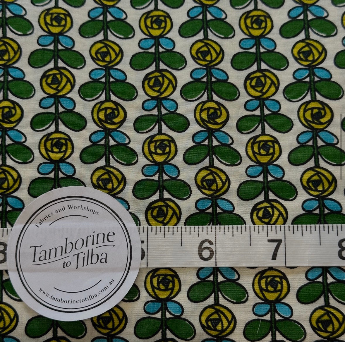 Fabric - Floral- (3518) Yellow, Blue & Green Stylized Flowers on Vanilla