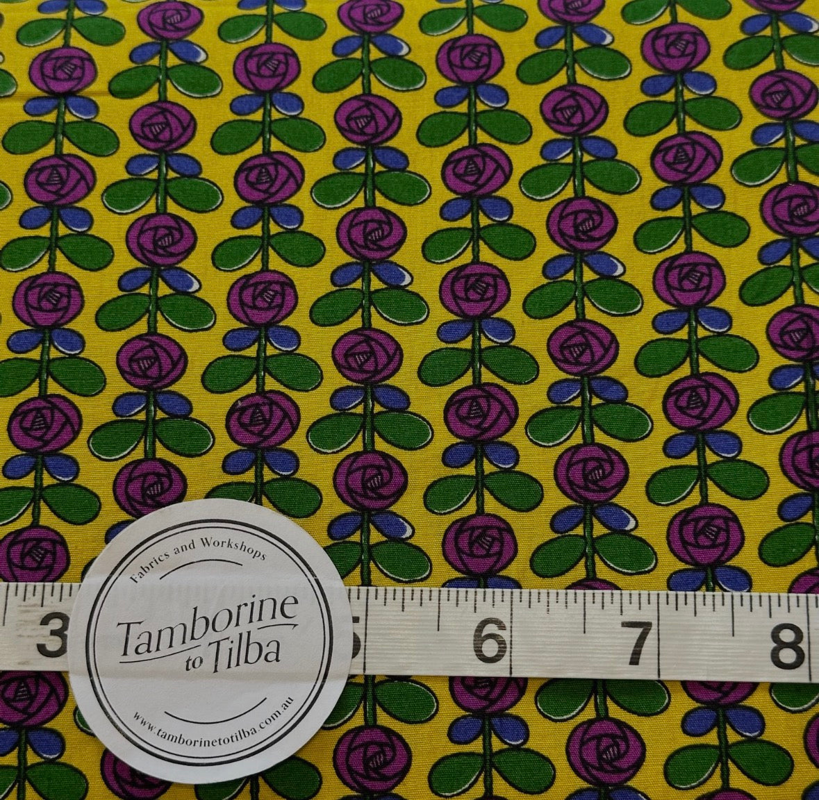 Fabric - Floral- (3519) Purple, Blue & Green Stylized Flowers on Yellow is backordered and will ship as soon as it is back in stock.