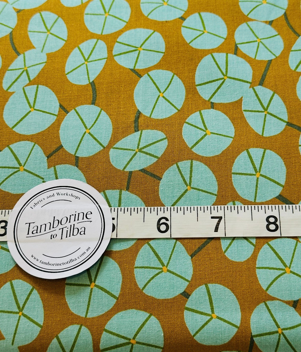 Fabric - Floral - (3539) Lotus Leaves in Mint on Mustard is backordered and will ship as soon as it is back in stock.