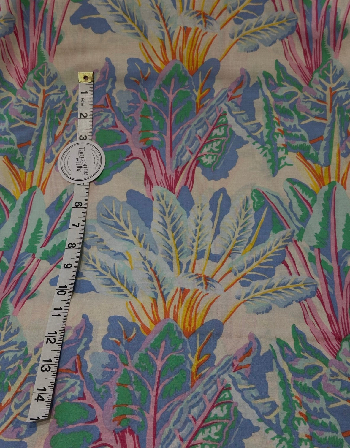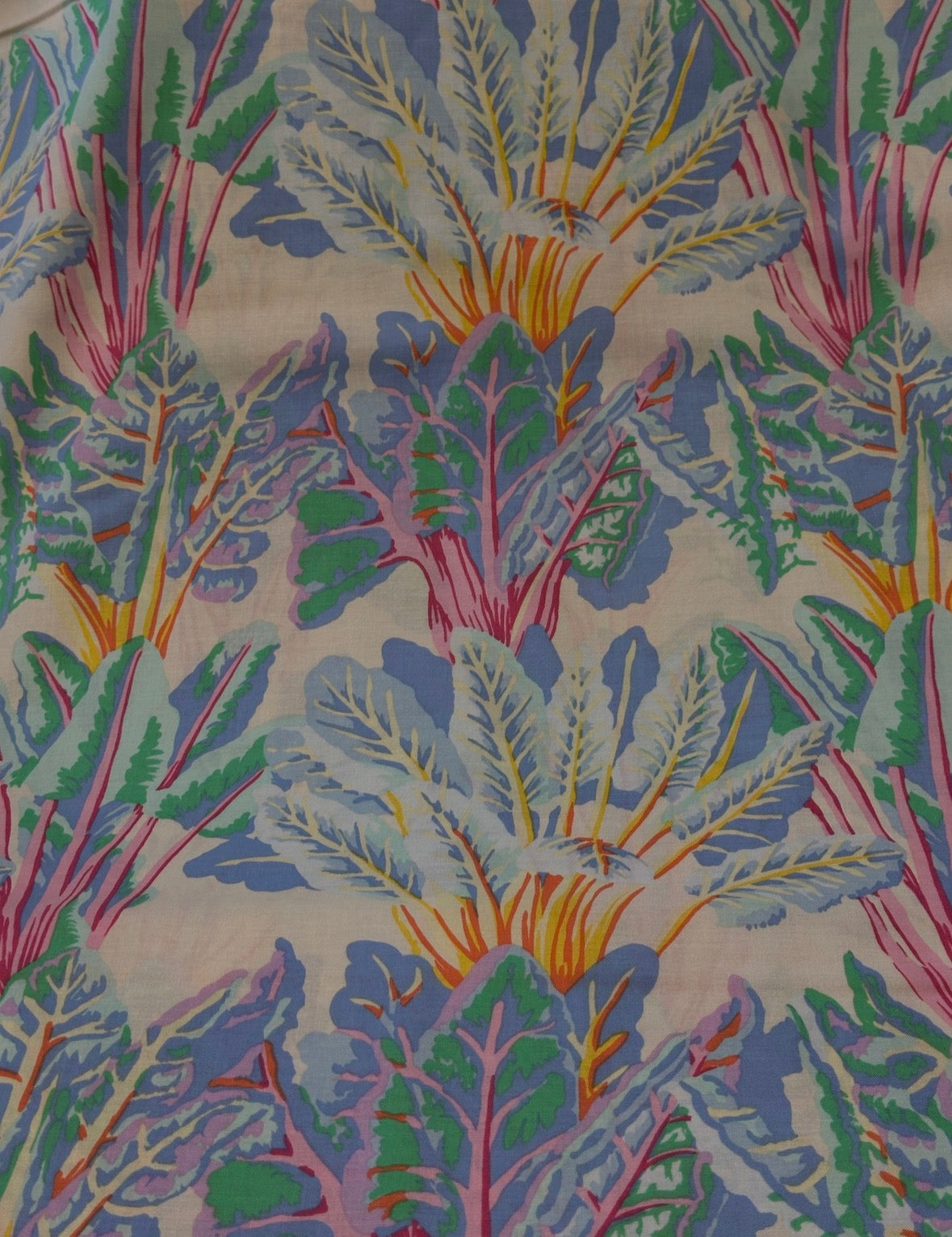 Fabric - Kaffe - (3268A) Leaves in Blues, Pinks & Yellows on Cream is backordered and will ship as soon as it is back in stock.