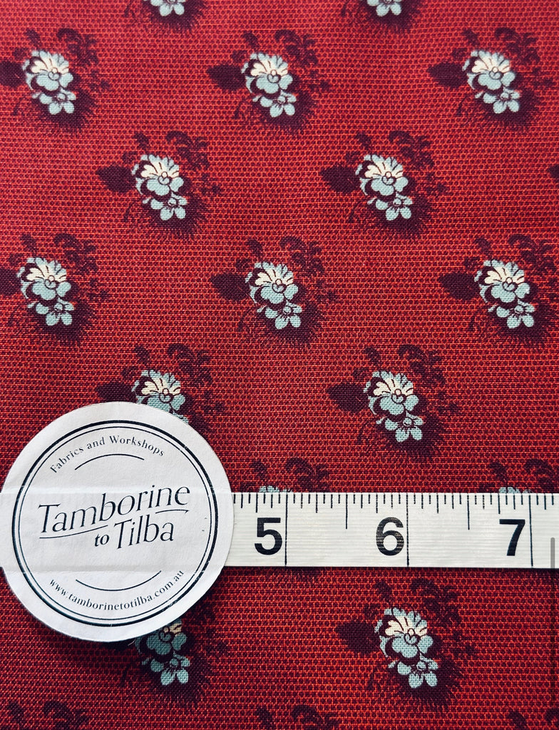 Fabric - Reproduction - (1947) Michelle Yeo Small Light Blue & Rich Red Floral on Red