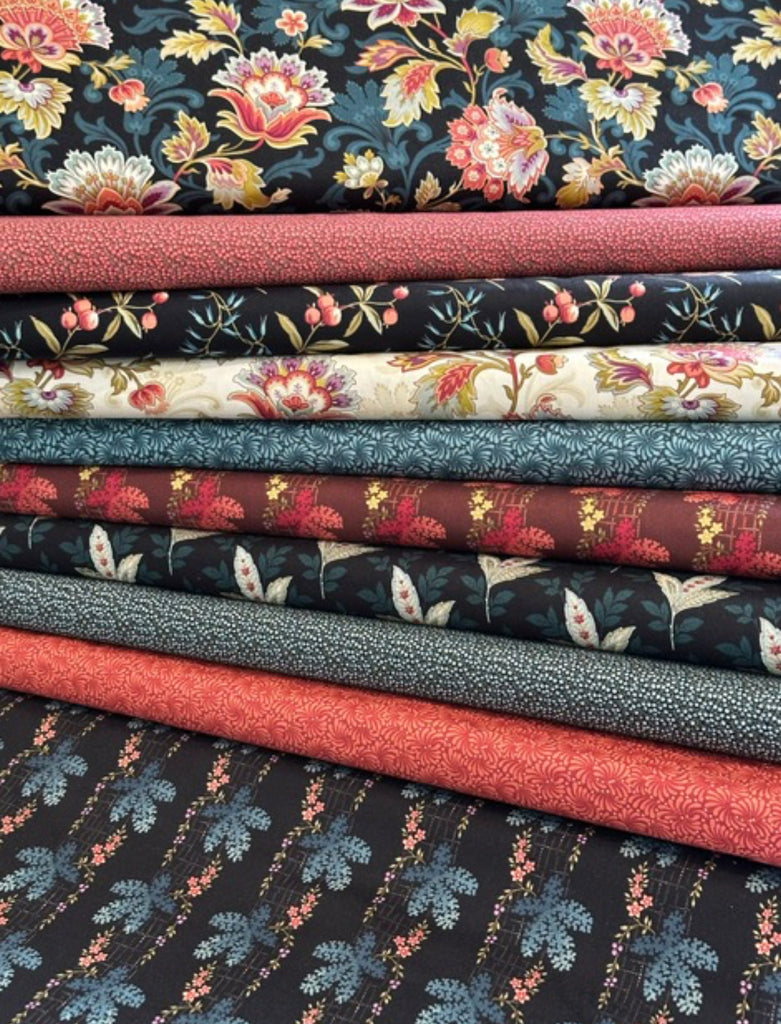 Fabric - Reproduction - (2127) Blue, Green & Black Flowers on Red
