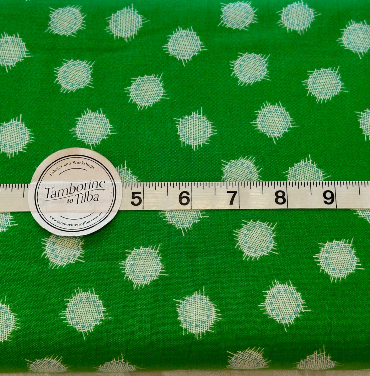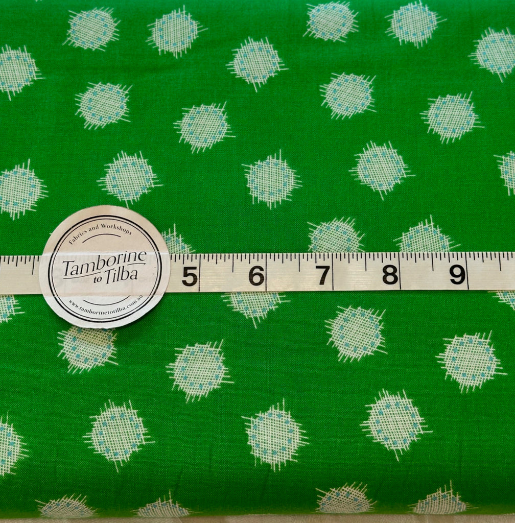 Fabric - Spots - (2261) Fuzzy Emerald, Green, Blue & VanillaSpots is backordered and will ship as soon as it is back in stock.