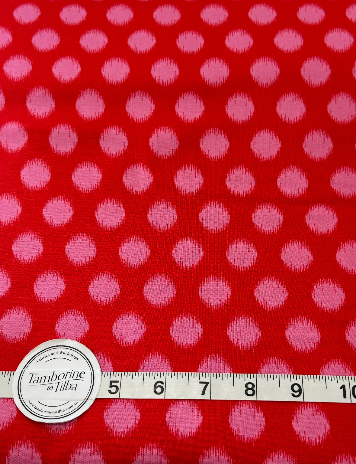 Fabric - Spots - (3067) Pink Fuzzy Spots on Red is backordered and will ship as soon as it is back in stock.