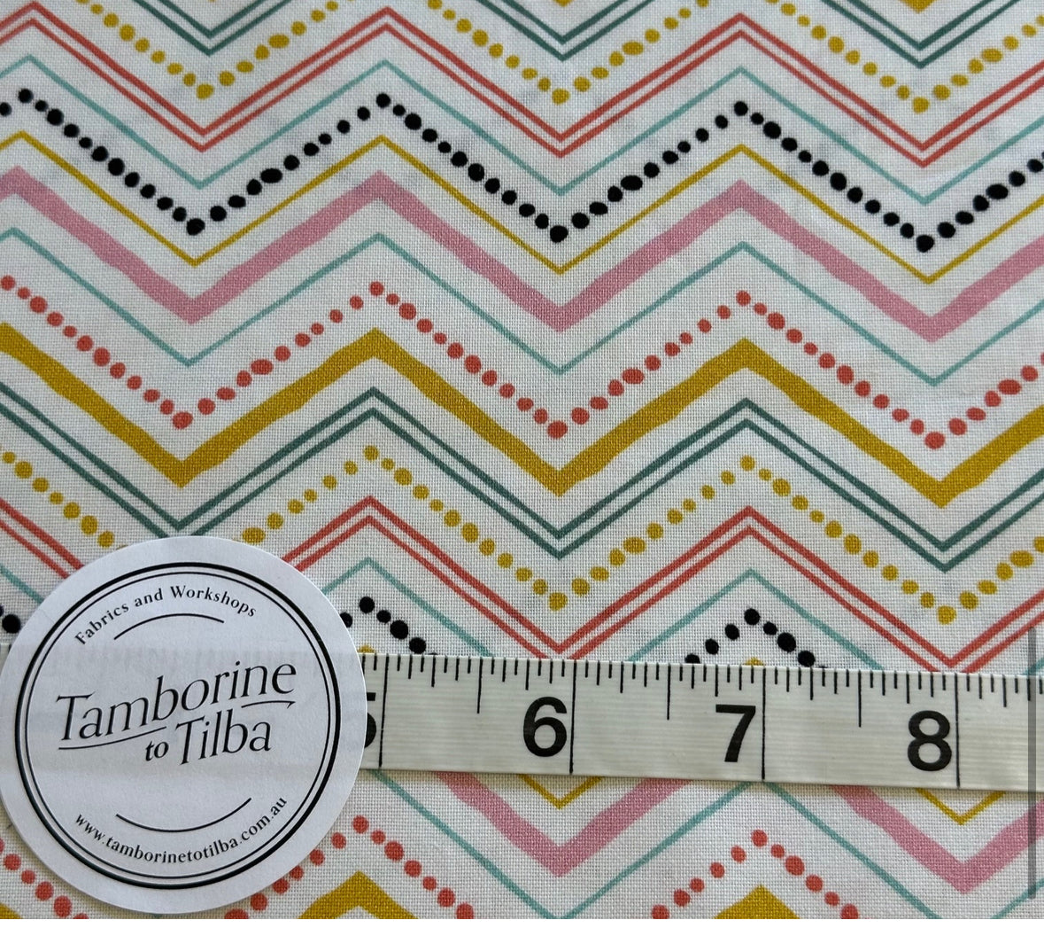 Fabric - Stripes - (3348) Multicoloured Chevron on Vanilla is backordered and will ship as soon as it is back in stock.
