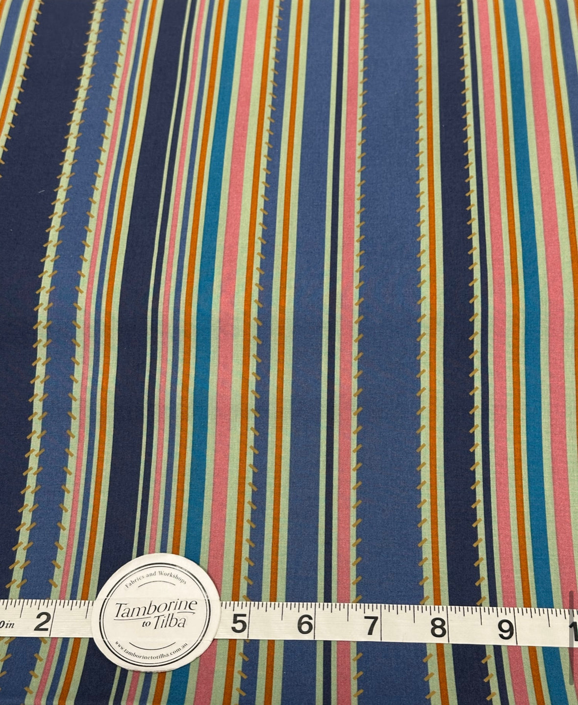 Fabric - Stripes - (3001) Navy, Teal, Rust, Blue & Seafoam with Saddle Stitching is backordered and will ship as soon as it is back in stock.