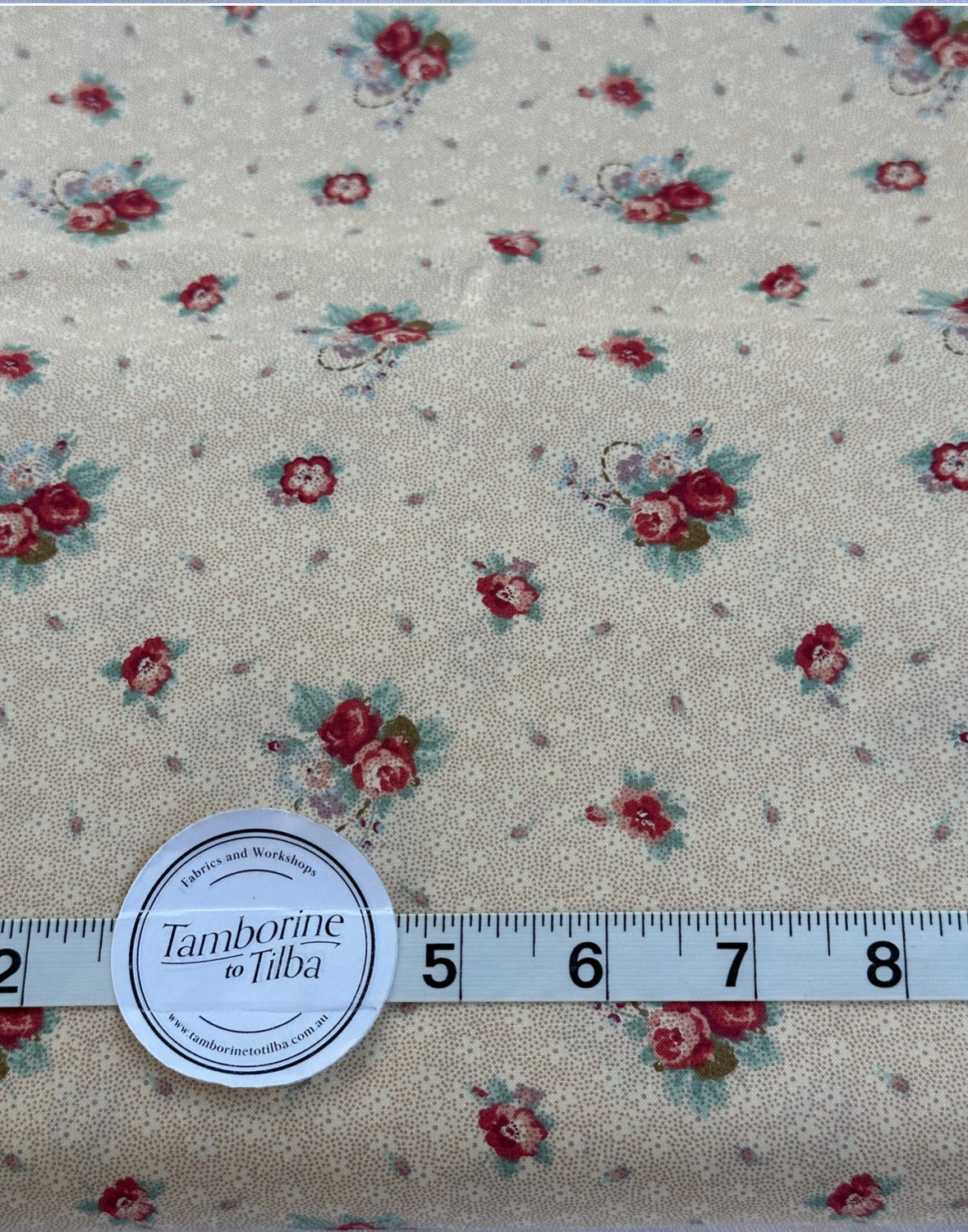 Fabric - Yuwa - (3158) Tiny Bunches of Roses in Red, Pinks & Greens on Biscuit Background is backordered and will ship as soon as it is back in stock.