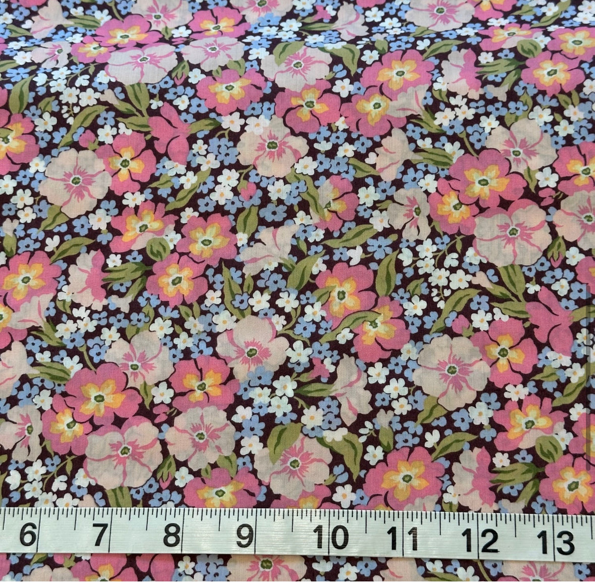Fabric - Liberty - (3454) Pretty Pink Flowers with Blue & White Forget me Nots on Black is backordered and will ship as soon as it is back in stock.