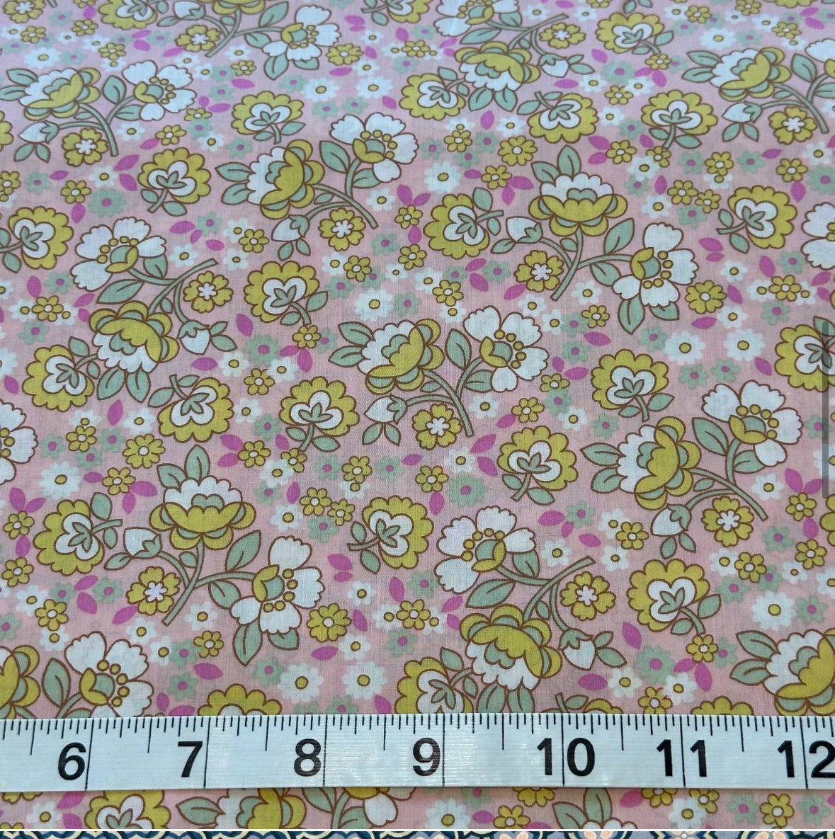 Fabric - Liberty - (3458) White, Chartreuse & Mint Green Floral on Pink is backordered and will ship as soon as it is back in stock.