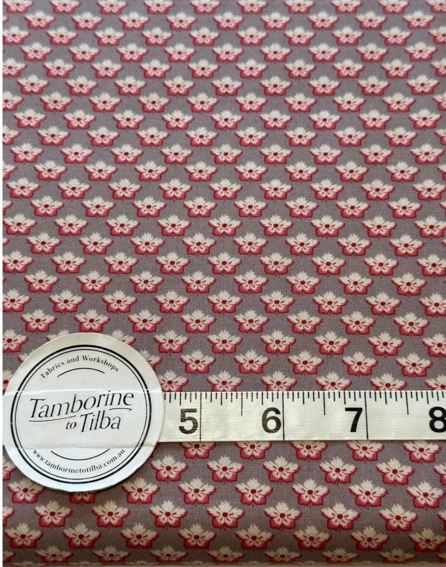 Fabric - Reproduction - (3089) Luccello Red, Pink & Vanilla Flower on Mauve/Grey is backordered and will ship as soon as it is back in stock.